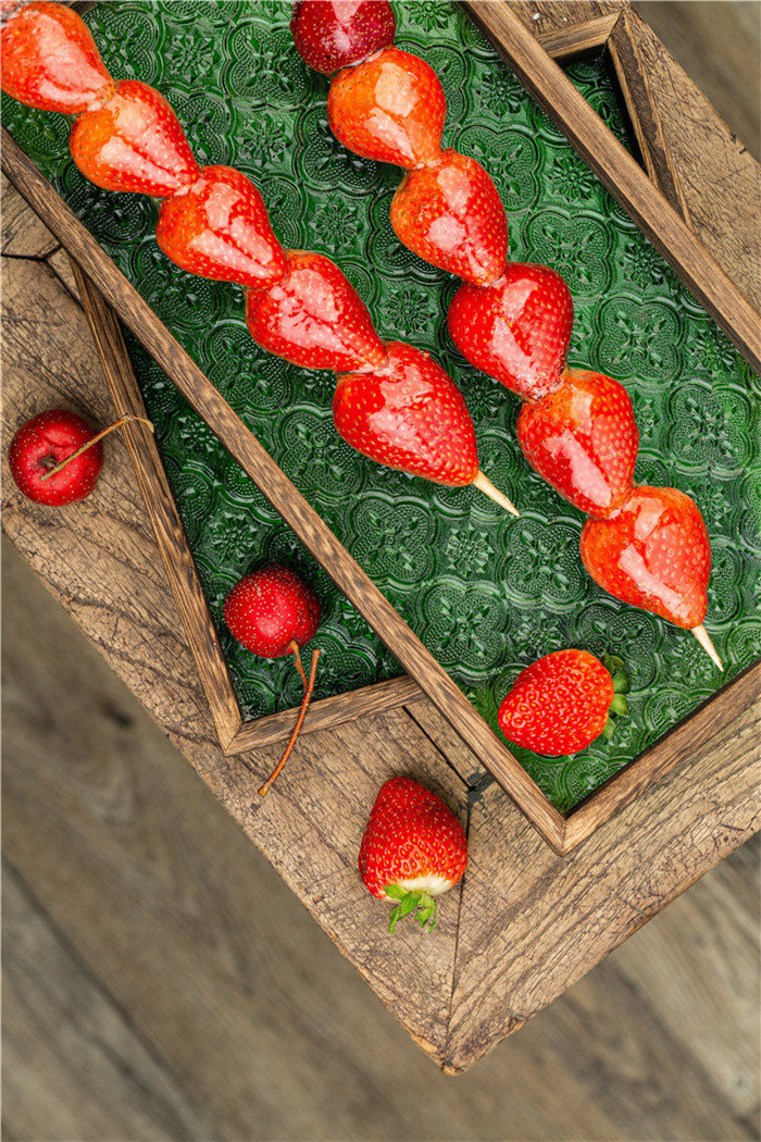 5、沾糖:沾糖时动作一定要快,慢了糖浠会降温凝固,同时沾的时候注意不要让高温的糖浠烫到手,沾好后的冰糖葫芦放到一块事抹上了一层油的平板上。喜欢的话,可以在糖浠里洒上点芝麻,这样吃起来更香。